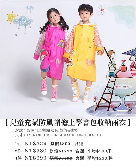 宅配創意兒童雨衣,充氣式帽沿不易被風吹開,俏皮設計讓人愛不釋手!收納書包空間、背部安全反光條,細心實用!
